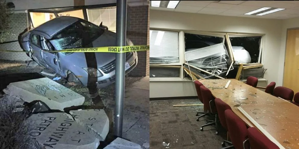 Por que si ayer mismo nos encontrábamos con una que tras una persecución policial no se le ocurría otra cosa que usar su Corvette C4 como proyectil contra la vivienda de su pareja, estando el dentro del vehículo, hoy conocemos la noticia de que otro estadounidense tenía la poca fortuna de conducir bajo los efectos del alcohol y terminar su malogrado viaje al estrellarse contra el último sitio contra el que debería haberse chocado, la sala de reuniones del cuartel de la policía estatal de tráfico de Ohio.