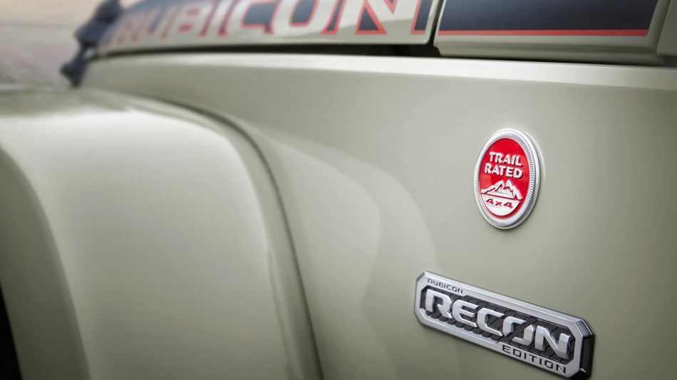 El nuevo Recon continua con el mismo motor V6 de 3.6L y 285 CV. Este se encuentra acoplado a una transmisión automática de 5 velocidades o a una manual de 6 cambios. En su parte delantera incorpora una Dana 44 con tubos y piezas reforzadas. Las relaciones son las mismas, las cuales permiten que al final se quede en 73, 1:1, que le otorga gran poder y capacidad para superar grandes obstáculos. Estéticamente el Recon presenta rines de 17 pulgadas con neumáticos BF Goodrich KM de 32 pulgadas, incluso puedes ser adaptables a 35 pulgadas si el cliente lo desea. También presenta una capota con dos respiraderos, una parrilla negra con insertos de color gris y un paragolpes delantero de acero. El Wrangler Rubicon Recon se encuentra disponible en siete colores: Negro, Blanco Bright, Plata Billet, Rojo Firecracker, Gobi, Rhino y Granite Crystal.