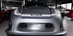 Partiendo desde estas ideas podemos apreciar el trabajo en el acabado externo del coche que sencillamente es todo un lujo. Comenzamos a describir su frontal, donde podremos observar cómo se modificó la trompa, colocando un capo tirado hacia abajo que cuenta con una entrada de aire central que contribuye a mantener en óptimas temperaturas el motor del vehículo. a los lados del capo vemos una especia de branquias, y finalizamos en la zona baja con dos tomas de aire situadas en cada lado, acompañadas de las luces o juego de ópticas compuestas por unos poderosos faros incrustados a los costados, protegidos por unas tapas plásticas que dan la sensación de ser de cristal. Cabe destacar las iniciales del preparador "DP" en la zona central del capo justo encima de dos líneas que rodean al coche hasta la parte trasera.