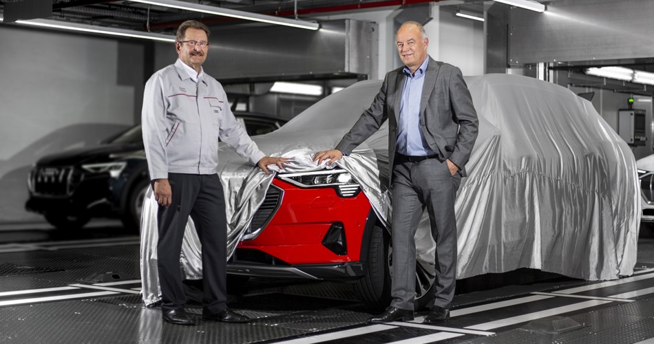 En color Rojo Misano y preparado para la carretera. Peter Kössler, Director de Producción y Logística de AUDI AG, y Patrick Danau, Director de Audi Bruselas, no pudieron resistir la tentación de ver rodar silenciosamente las primeras unidades de Audi e-tron saliendo de la línea de montaje. "El Audi e-tron es un pionero genuino", afirma Peter Kössler. "Cuenta con tecnologías tan innovadoras como los espejos retrovisores exteriores virtuales; y combina las cualidades propias de Audi en lo referido a dinámica de conducción con la estrategia Vorsprung, que va mucho más allá del automóvil. Nuestra planta de Bruselas se ha modernizado ampliamente para la producción de este vehículo eléctrico. Se trata de la primera producción en serie del mundo, dentro del segmento Premium, que cuenta con certificado de emisiones neutrales de CO2". Audi Bruselas compensa todas las emisiones producidas en la producción y en la propia planta, principalmente, mediante el uso de energías renovables, pero también a través de proyectos ambientales.