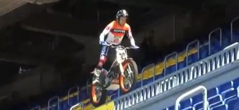 Tener 9 campeonatos del Mundo de trial da ciertas ventajas, como por ejemplo entrenar en lugares insólitos. Llegar con tu moto y subirte por cualquier pared, barandilla o escalera. Eso es lo que hace Toni Bou, el campeón de Piera. Y así, pues se puede entrenar en cualquier lado... incluso en las gradas de un estadio de fútbol.