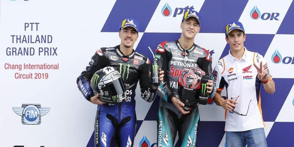 Fabio Quartararo ha sido el claro vencedor en la batalla por la pole. La sesión de clasificación del Gran Premio de Tailandia ha estado muy disputada, con el francés, Marc Márquez y Maverick Viñales peleando por la posición de honor en la parrilla de salida. Finalmente, el piloto de Petronas Yamaha SRT ha sido el más rápido, fijando el crono en 1:29.719. Un tiempo que venía mejorando en su última vuelta lanzada y que no ha podido rebajar debido a una caída en la curva 5, donde también se ha ido al suelo Márquez.