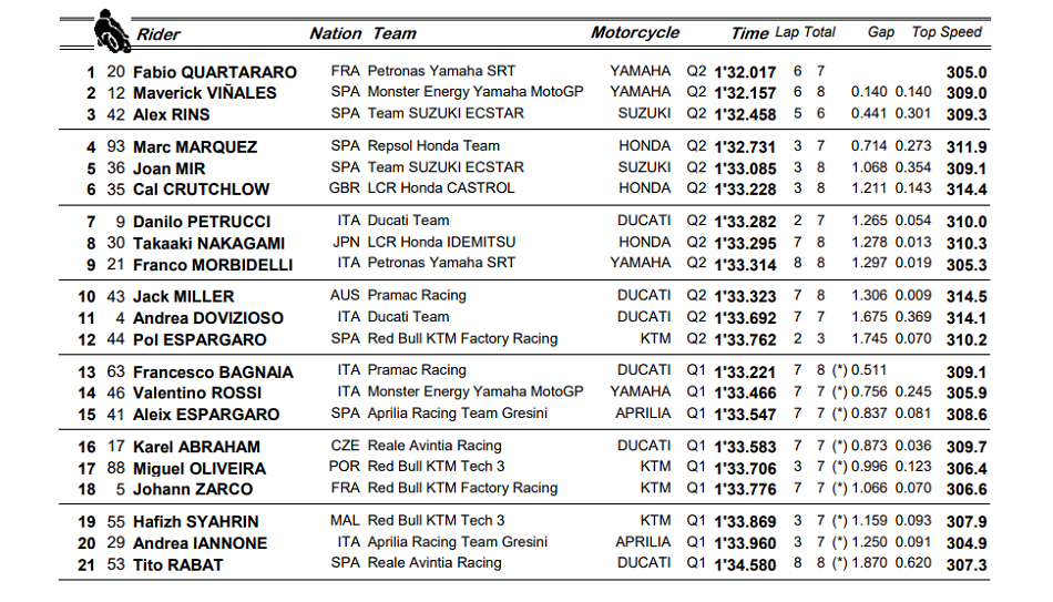 El rookie consiguió su tercera pole del año. Detrás de él saldrán Rins y Viñales. Y por primera vez este año Marc Márquez saldrá desde la segunda línea (4º), y casi que dando gracias. El líder del mundial se llevó un buen susto en la curva uno, pero, otra vez, consiguió salvar los muebles. Joan Mir saldrá 5º, siendo ésta la mejor posición del año en clasificación para él.