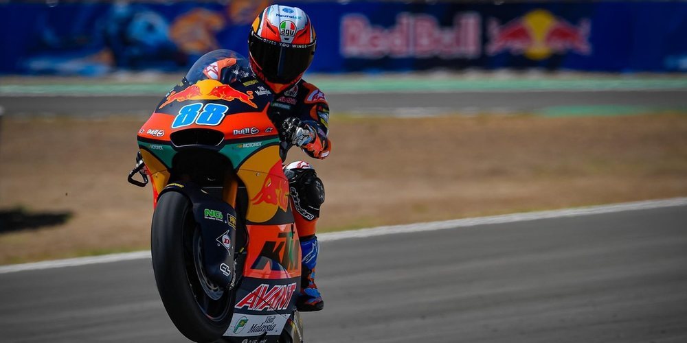 Jorge Martín ha vuelto a la senda de la 'pole position'. El piloto madrileño, campeón del mundo de Moto3 en 2018, ha conseguido hoy, por vez primera, el mejor tiempo en una QP de la categoría intermedia, con casi dos décimas de ventaja sobre el segundo clasificado. Que Martín consiga la 'pole' es motivo de preocupación: el piloto de KTM acumula 21 relojes en su haber, y un buen rendimiento el sábado suele implicar una amenaza de cara al domingo.