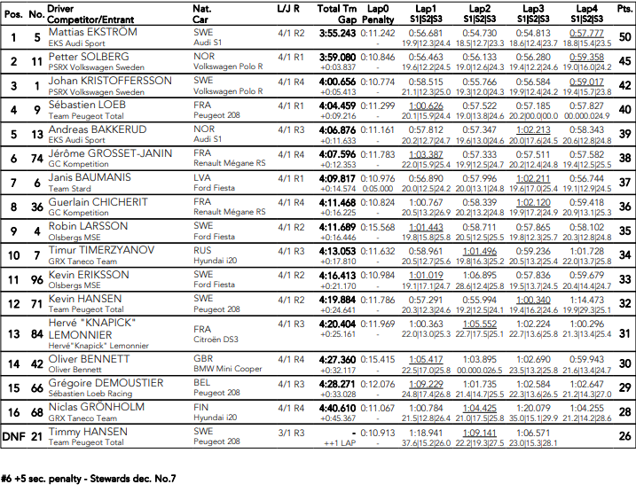 Timmy Hansen fue el único que no pudo acabar la primera de las clasificaciones de esta ronda, quedando fuera antes de completar la última de las vueltas. Su compañero de equipo, Sébastien Loeb, quedó lejos de los pilotos de delante pero pudo acabar 4º para sumar un gran número de puntos de cara a esta primera fase. La distancia entre todos fue bastante alta, pues la lluvia y el barro formado no ayudó absolutamente a nadie en estas primeras carreras del día.
