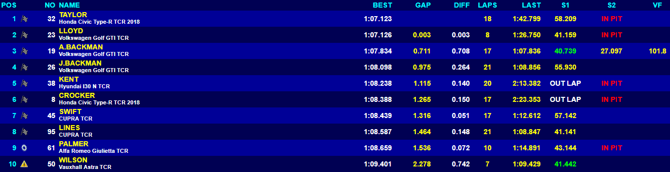A pocos minutos para el final, 0,003 segundos de renta ha puesto encima de la mesa el Honda Civic Type R FK7 TCR de 'Ollie' Taylor para superar el gran tiempo de su máximo rival y líder del campeonato, que hasta ese momento le superaba por más de siete décimas de diferencia. No le dejó tiempo de reaccionar y saltó la sorpresa para darle algo de emoción a esta competición que tras el dominio abrumador de Lloyd había bajado el nivel levemente.