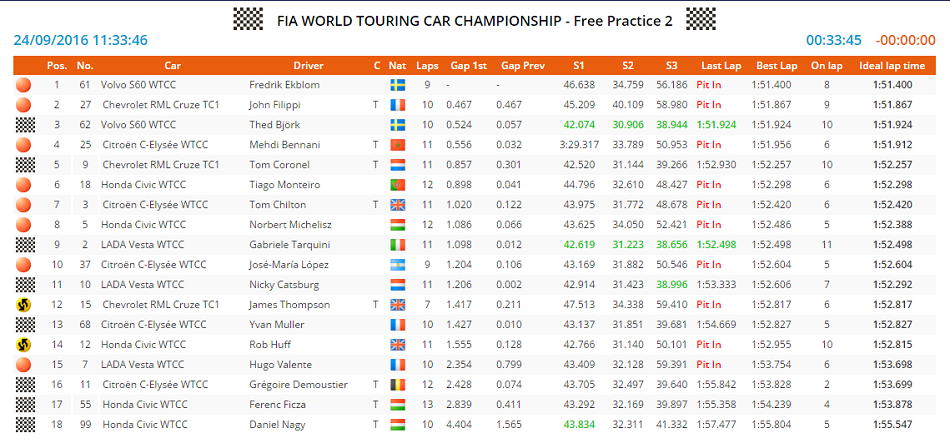 Si en los primeros entrenamientos era el sueco del Volvo S60, Thed Björk, el que se llevaba la primera posición, en esta ocasión el turno de conseguir el mejor tiempo de la sesión ha sido para Fredrik Ekblom. El piloto que conduce otro de los Volvo S60 de la parrilla se ha colocado en primer lugar tras una tanda algo más rápida que la anterior, viéndose ya la adaptación de los pilotos al circuito de manera completa. El sueco ha liderado con el propio Thed Björk en tercera posición y el Chevrolet Cruze de John Filippi entre ellos dos.