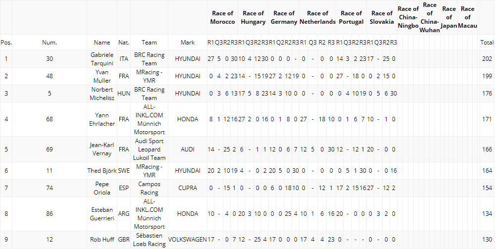 Ha cerrado el 'top' 10 el galo Yann Ehrlacher que se ha visto superado nuevamente por su compañero argentino pero ha mejorad a Timo Scheider que en esta ocasión ha terminado 18º. Los Volkswagen Golf GTI TCR no han estado tan bien en esta tanda y han sido 16º y 17º con el marroquí Mehdi Bennani por delante del británico Robert Huff, a 1,2 y 1,3 segundos del líder, una separación muy corta para tantas posiciones por detrás. Los problemas para salir de Pepe Oriola apenas le han permitido dar 5 giros, siendo su mejor tiempo casi segundo y medio más lento que el de Björk, teniendo que aparcar su Cupra León TCR en el 23º puesto.