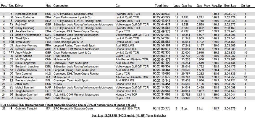 Desde que se dio la salida, el Hyundai i30 N TCR número 5 de BRC Hyundai N Squadra Corsa ha volado sobre el trazado de Vila Real. Nadie le ha podido siquiera asustar y es por ello que ya en la tercera vuelta, la primera en la que se podía tomar el comodín, hizo uso de este sin perder su 1ª plaza. Su compañero Augusto Farfus sale contento también al terminar 3º esta carrera, pero se lamenta de perder la 2ª posición en la que había iniciado la sesión. El comodín fue su perdición ya que Yann Ehrlacher lo tomó una vuelta más tarde y le ganó el sitio, asegurándose además no sentir la presión de Robert Huff, 4º a medio segundo de subirse al podio.